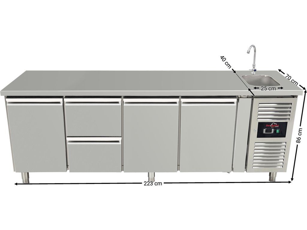 Refrigerated table with sink with 3 doors and 2 drawers middle left