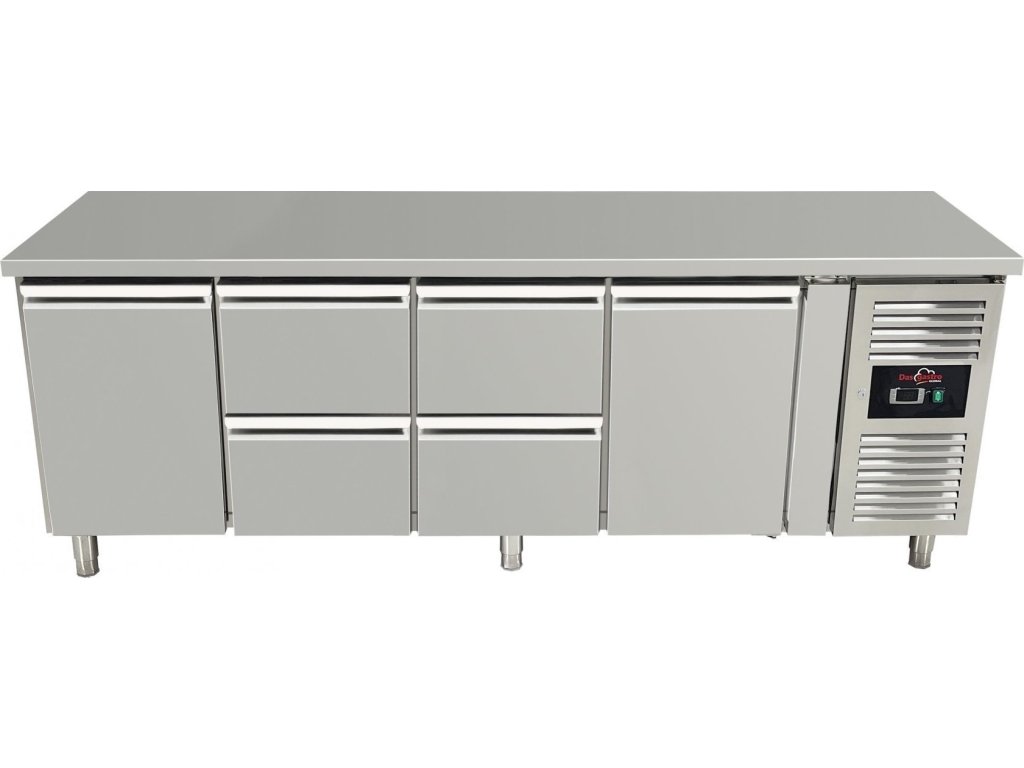 Refrigerated table with 2 doors on the sides and 4 drawers in the middle