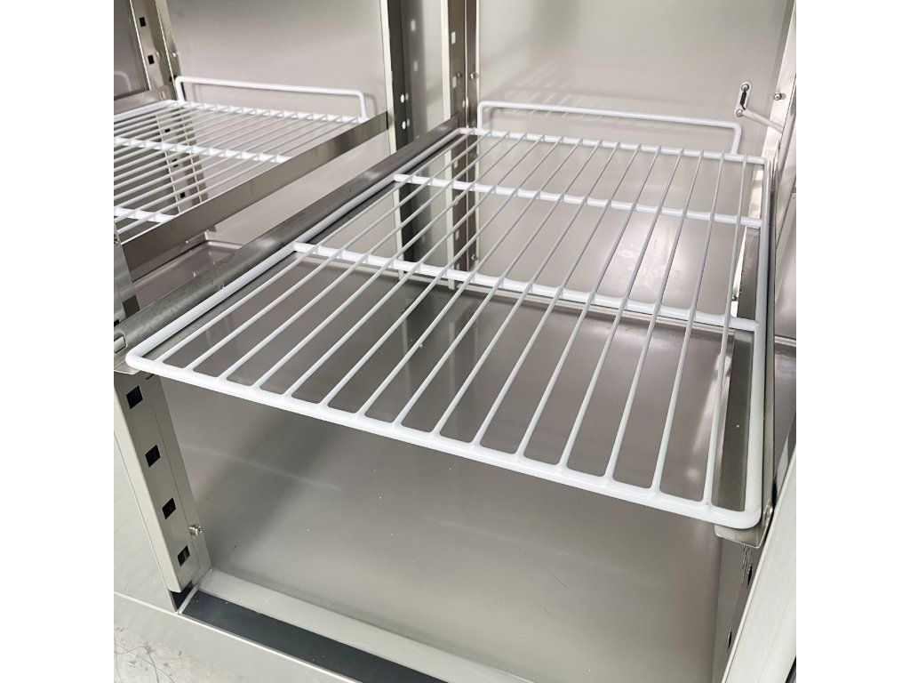 Vnitřní police odpovídají velikosti přepravek EN (630 × 410 mm) – vhodné pro pečivo i standardní gastro nádoby