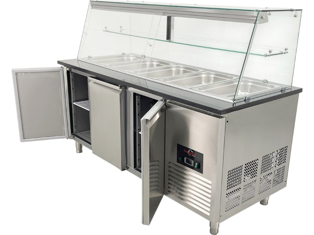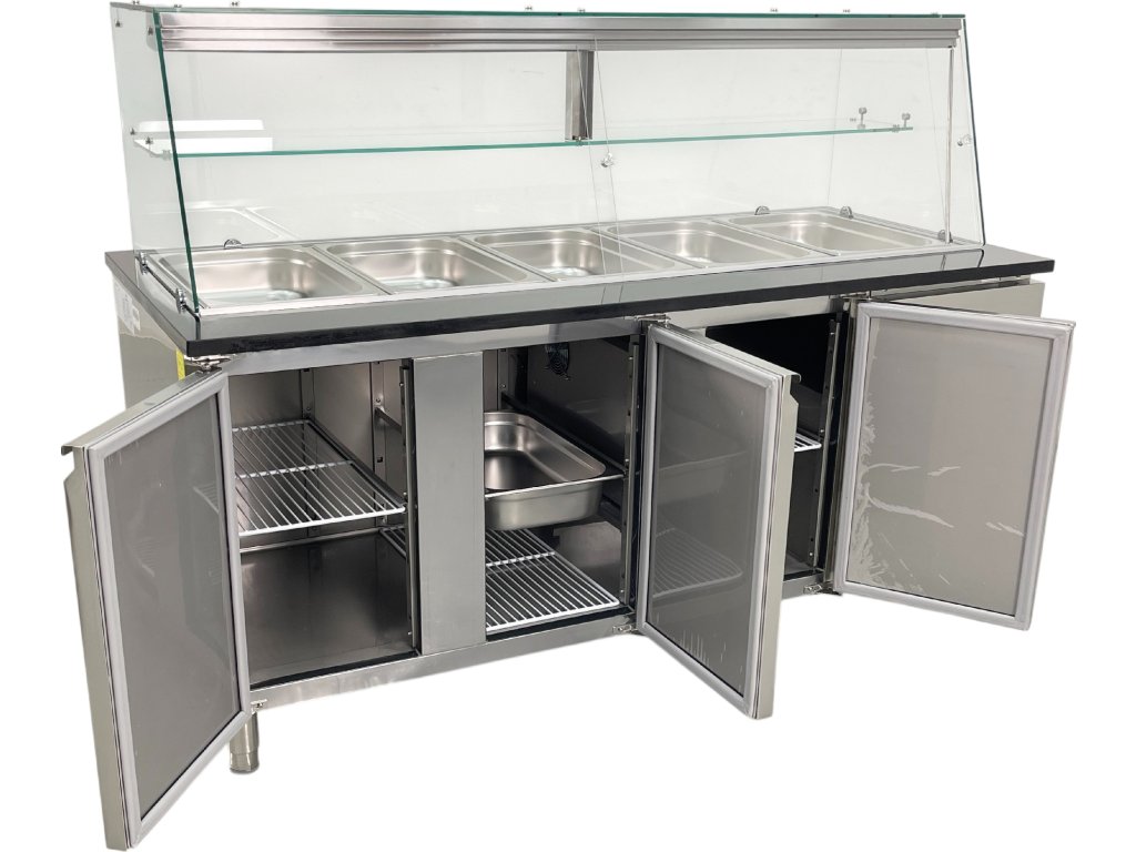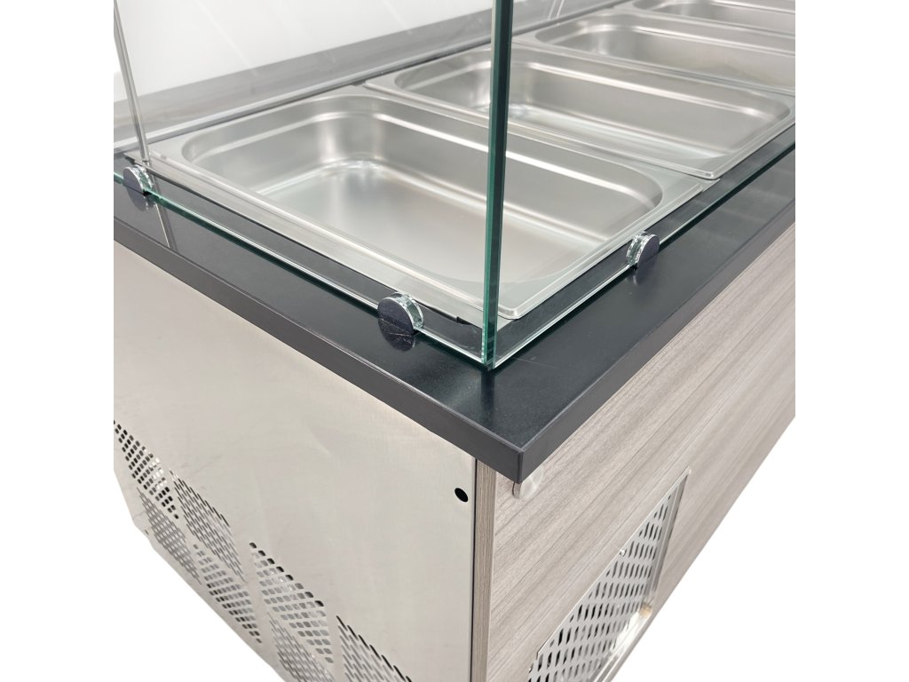 Gekühlter Buffettisch zur Präsentation und Ausgabe von Fertiggerichten in Gastronomiebetrieben, Kantinen oder Hotelbuffets. Der obere Teil bietet Platz für fünf GN 1/1-Behälter , die unter einer Glasplatte mit integrierter Beleuchtung übersichtlich präsentiert werden. Der untere Teil bietet gekühlten Lagerraum mit der Möglichkeit zum direkten Einsetzen von GN-Behältern.
