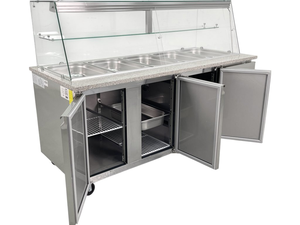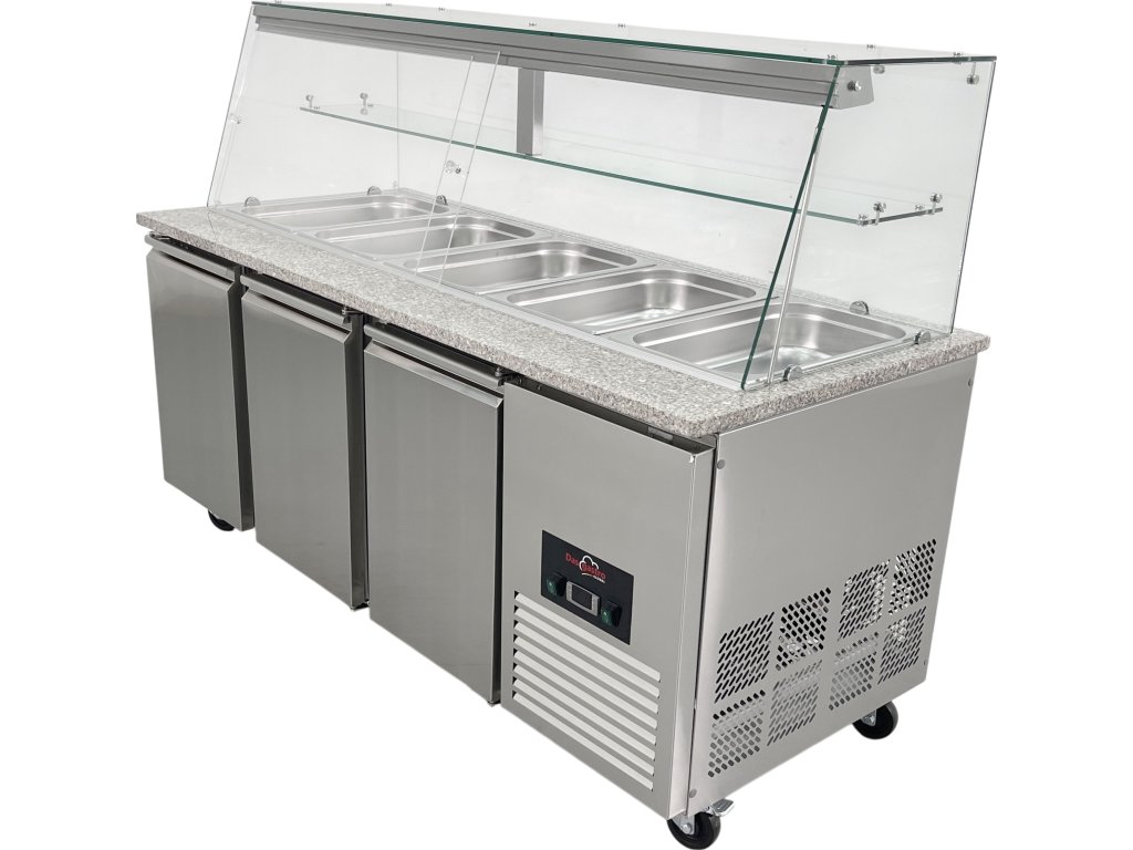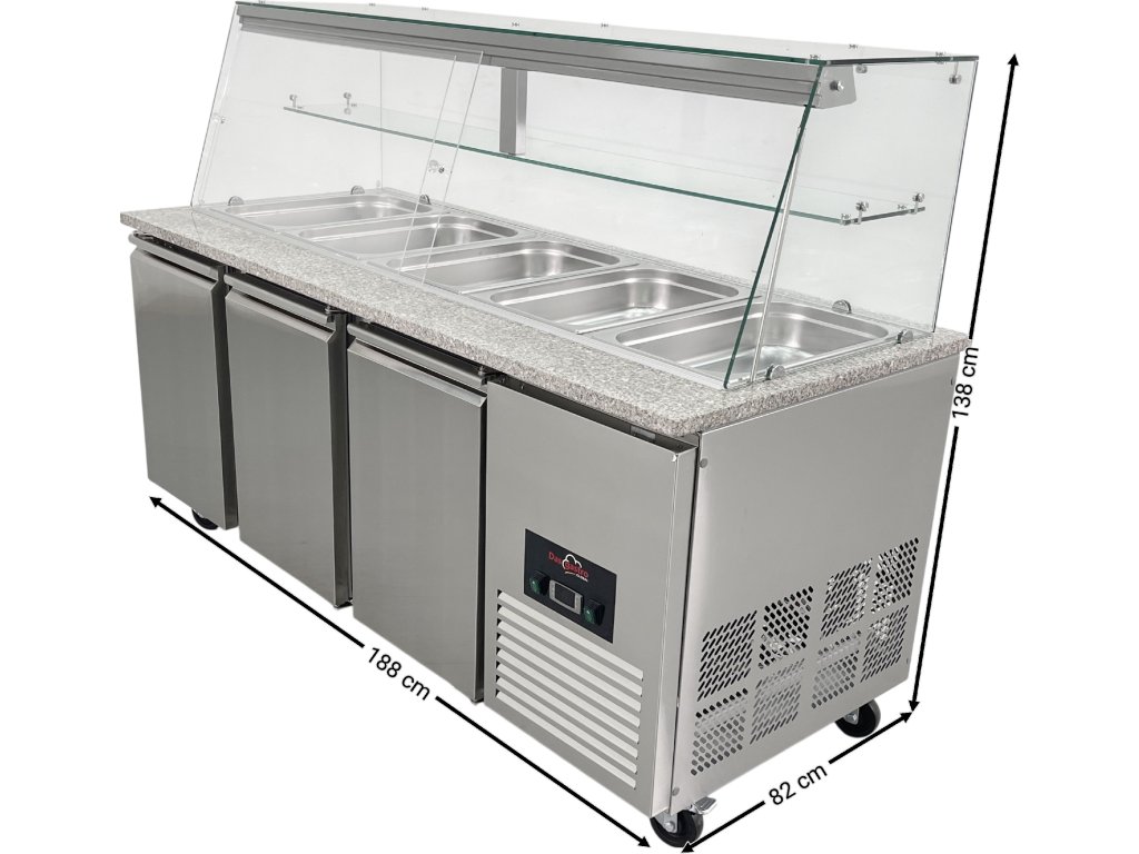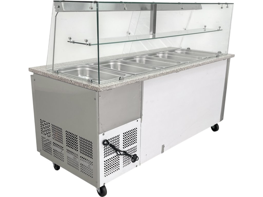 Kühltisch für Dönerstände und andere Gastrobetriebe. Der obere Teil bietet Platz für 5 GN 1/1 Behälter , wobei die Speisen unter einer Glasplatte mit integrierter Beleuchtung übersichtlich präsentiert werden. Der untere Teil bietet einen gekühlten Lagerraum mit der Möglichkeit zum direkten Einsetzen von GN-Behältern.