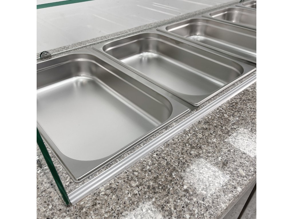 - Der obere Teil des Tisches ist für die Ausgabe von Speisen aus GN-Behältern vorgesehen – bis zu 5× GN 1/1