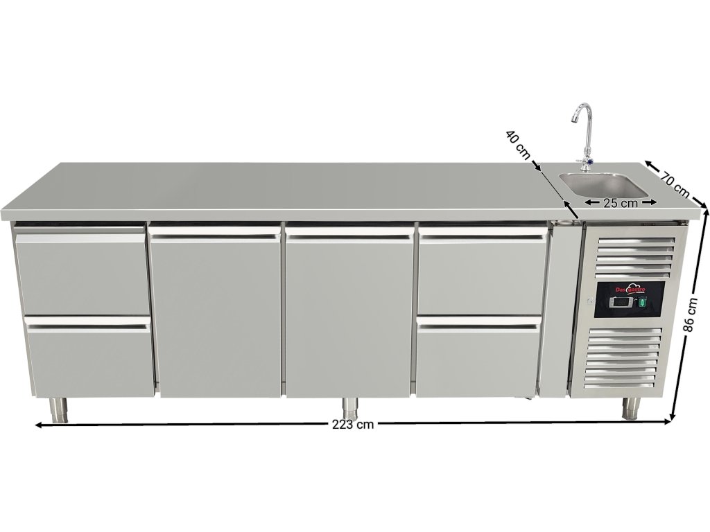 Kühltisch mit Spüle, 2 Türen in der Mitte und 4 Schubladen an den Seiten