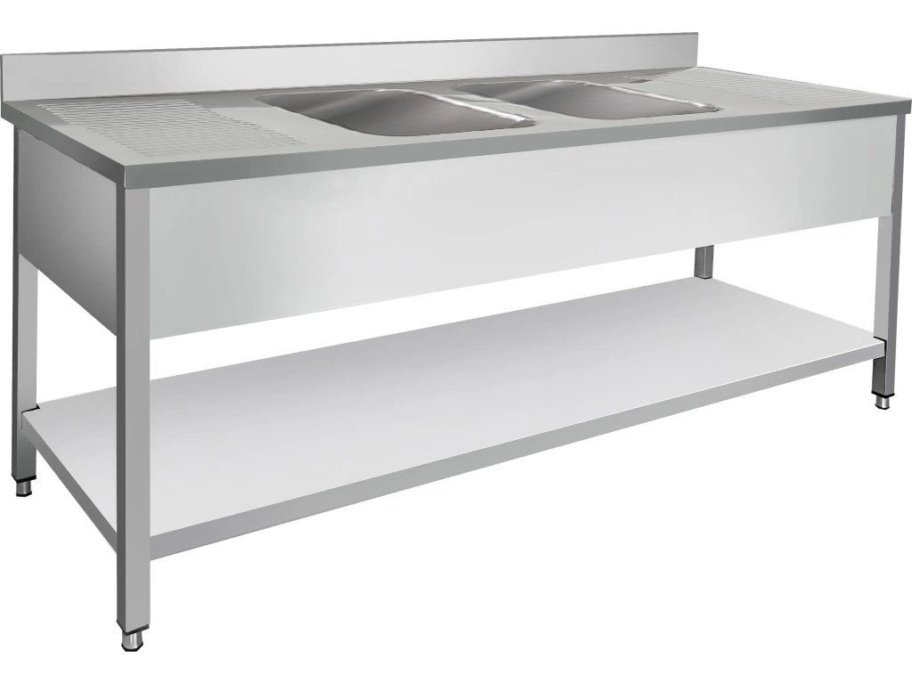 Edelstahlspüle mit Ablage 2,0 m, 2 Becken in der Mitte, Tiefe 70 cm