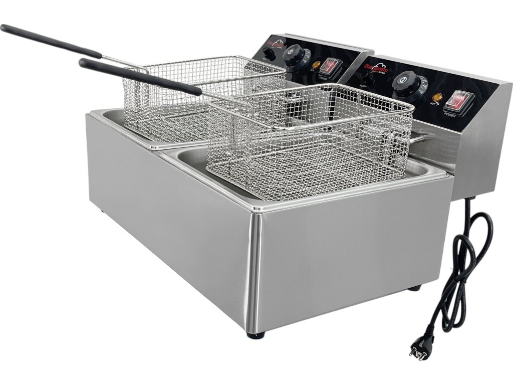 Eine zuverlässige elektrische Fritteuse mit zwei separaten Tanks mit jeweils 6 Litern Fassungsvermögen ist für den täglichen Einsatz in der Gastronomie konzipiert, wo mehrere Arten von frittierten Speisen gleichzeitig zubereitet werden müssen – schnell, effizient und sicher. Die ideale Wahl für Restaurants, Bistros, Stände und Foodtrucks. Sie bietet einfache Bedienung, leichte Wartung und hohe Leistung.