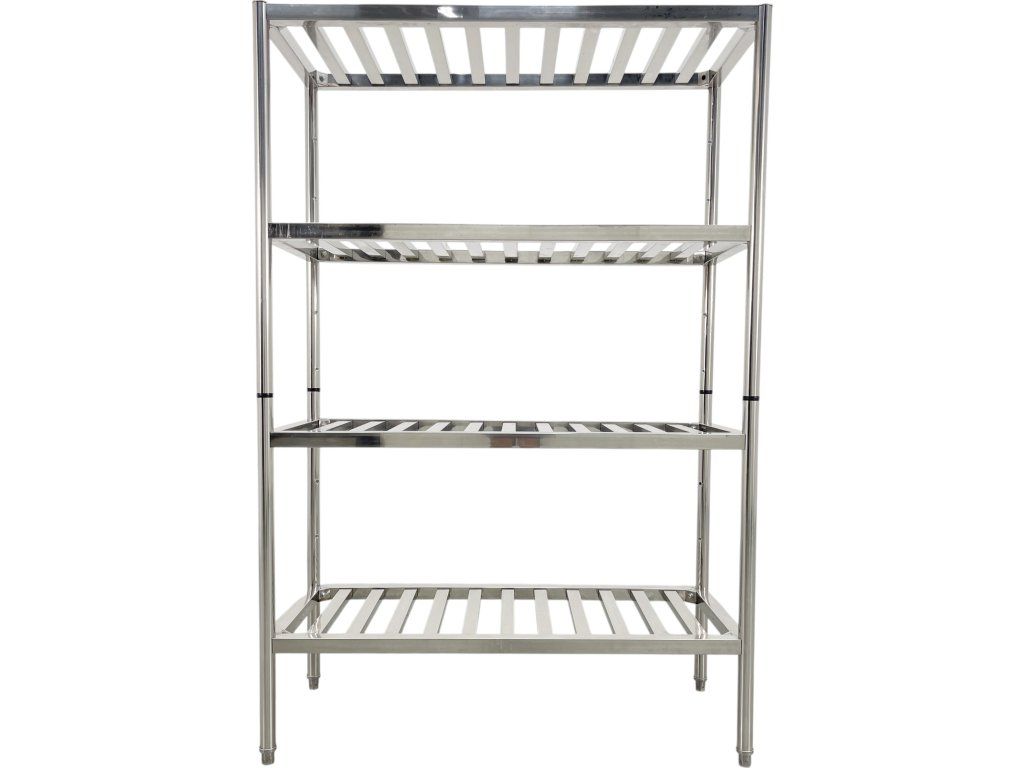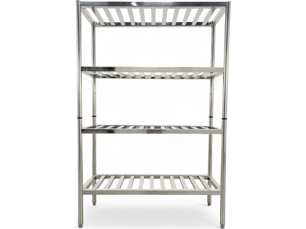 Dieses Edelstahlregal ist die perfekte Wahl für alle Umgebungen, in denen Qualität, Langlebigkeit, Hygiene und Flexibilität im Einsatz wichtig sind. Die offenen Regale bieten maximale Übersicht und einfachen Zugriff auf die gelagerten Gegenstände.