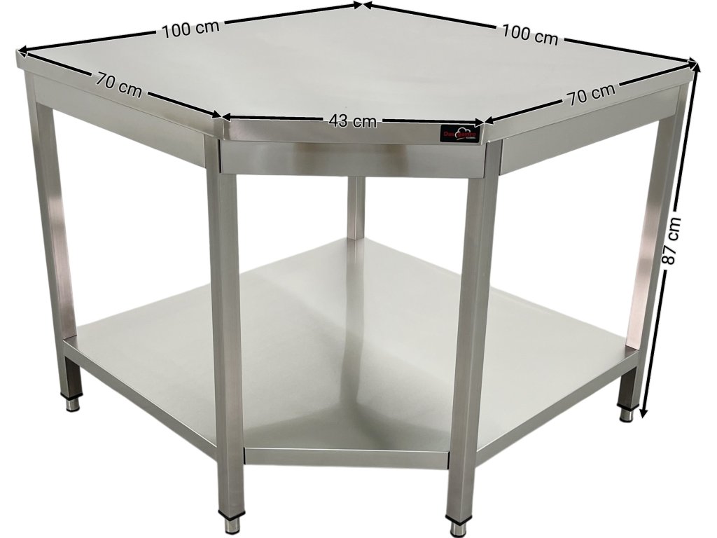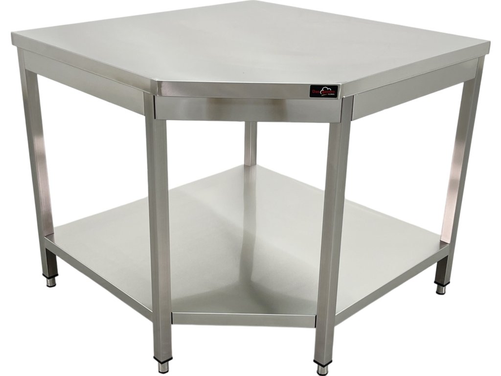 Die Eckwerkbank ist die ideale Lösung für die effiziente Nutzung von Eckflächen in professionellen Küchen. Sie verbindet zwei Arbeitslinien und bietet gleichzeitig eine stabile und hygienische Arbeitsfläche. Dank der unteren Ablagefläche können Utensilien und Geräte praktisch verstaut werden.