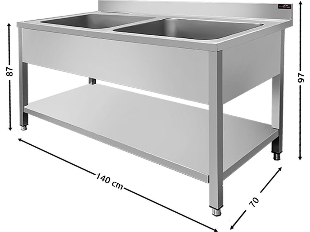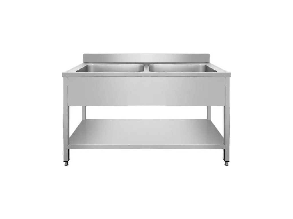 Nerezový umývací stôl PREMIUM s dvoma drezami uprostred, spodnou policou a zadným lemom 1,4 m