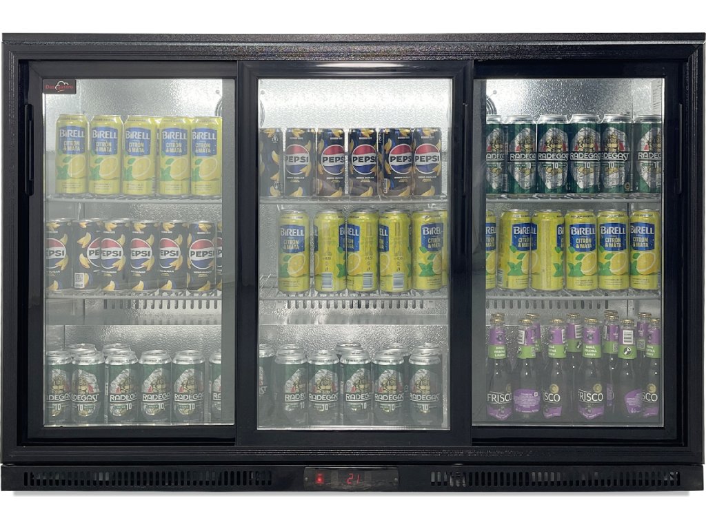 Lodówka barowa - 1350 x 540 x 900 mm, z 3 szklanymi drzwiami i 2 półkami - czarna