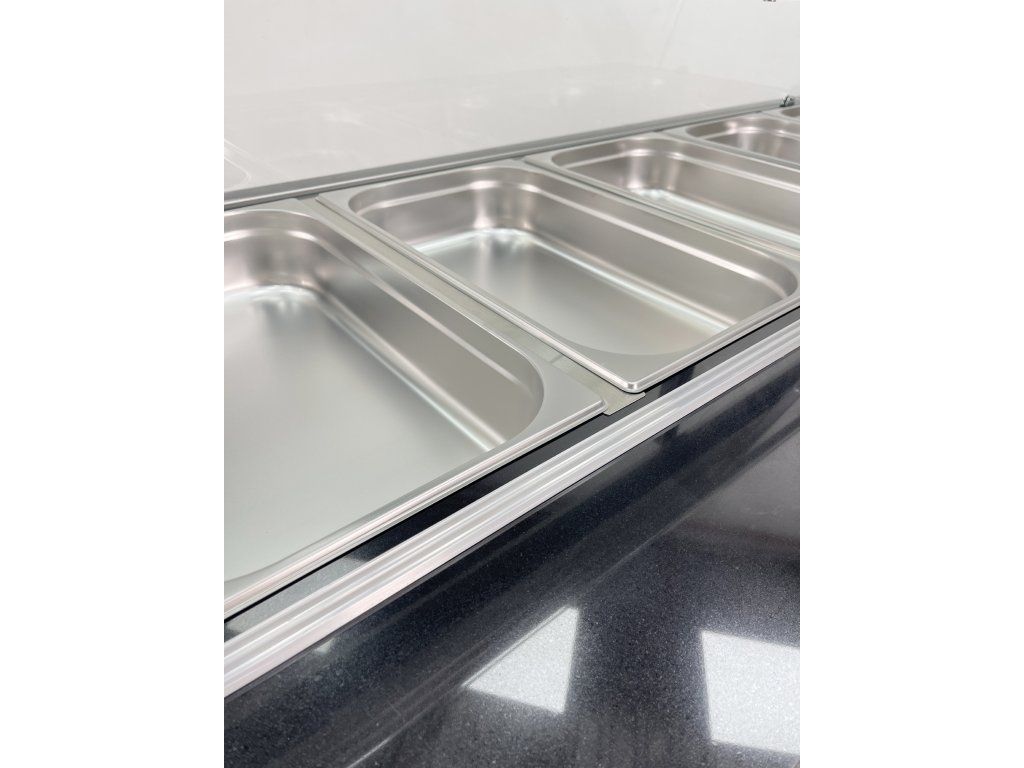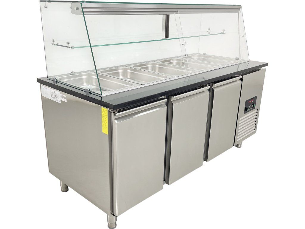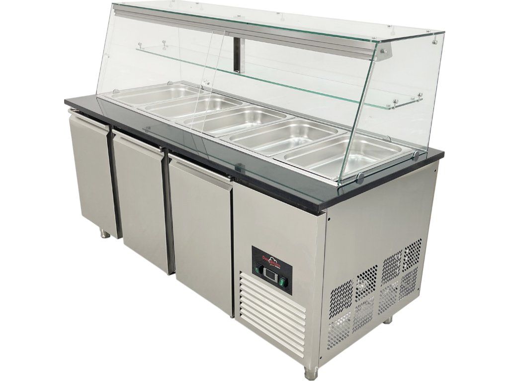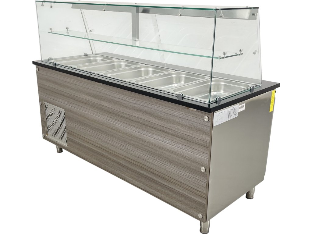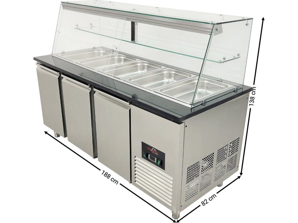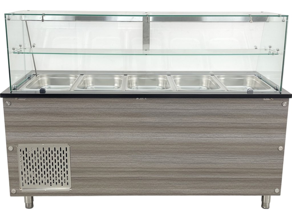 Stół bufetowy chłodniczy przeznaczony do prezentacji i serwowania gotowych posiłków w lokalach gastronomicznych, stołówkach lub hotelowych bufetach. Górna część jest wyposażona w miejsce na 5 pojemników GN 1/1 , gdzie potrawy są wyraźnie eksponowane pod szklanym blatem ze zintegrowanym oświetleniem. Dolna część oferuje chłodzoną przestrzeń magazynową z możliwością bezpośredniego wstawiania pojemników GN.