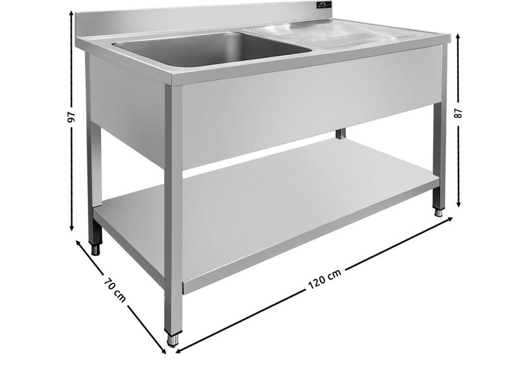 Zlewozmywak ze stali nierdzewnej PREMIUM z jednym zlewem po lewej stronie, dolną półką i tylną krawędzią o długości 1,2 m